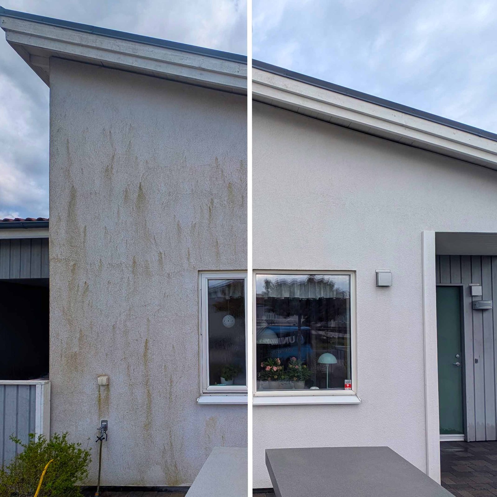 Rätt metod är softwash (lågtrycksbehandling) med foam-lance och tryckmatad borste. Det rengör skonsamt, dödar påväxten på djupet och ger ett betydligt mer hållbart resultat.